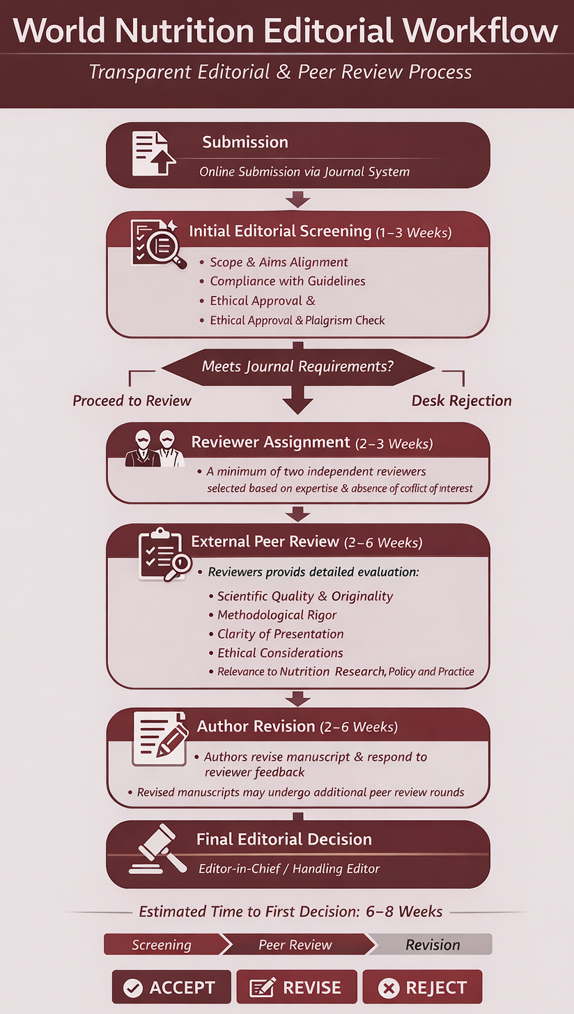 World Nutrition maintains full transparency in its editorial decision-making, peer-review procedures, and publication ethics. All editorial policies are publicly available, regularly reviewed, and updated in alignment with evolving best practices in scholarly publishing.